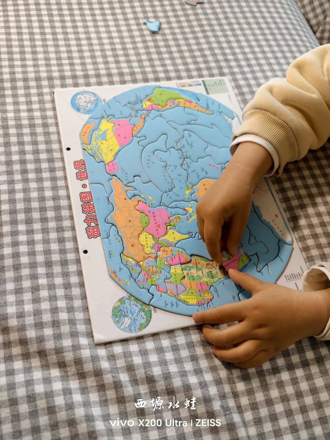 我带娃学习,每天也就是这么多时间,其余时间都是她自己玩,爱玩啥就玩啥,我从不干涉。 有时我也跟她一起玩。 她现在已经能熟练地把中国地图拼图拼好了,拼图中各省、自治区的名称她都能正确地读出来。去年底,每次拼到西藏自治区时,她都要指着日喀则说“爸爸去过。” 拼到海南岛时,也要说“妈妈坐飞机去三亚。” 还要用手指着从三亚经东海到上海的海上路径,说“妈妈从三亚回到上海”。世界地图比较难,字太小,有很多国家的名称娃不认识,现在她也能拼三分之二以上了。