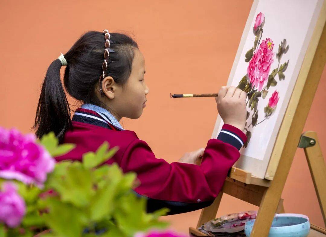在“赏牡丹・踏春识芳” 篇章,师生们漫步园中,近距离观赏牡丹的娇艳风姿,在老师的讲解下辨识牡丹品种、了解生长习性,于自然之中感受生命之美,在踏春赏景间学会识花明礼、敬畏自然;“颂牡丹・惠声咏志” 篇章里,经典诵读声绕校园,学校围绕牡丹文化开设诗词曲联特色课程,组织开展主题作文竞赛,孩子们以诗咏牡丹、以文抒胸臆,在诵读经典中积累文化底蕴,在笔墨创作中抒发奋进之志;“绘牡丹・丹青溢彩” 篇章中,绘画大赛火热开展,孩子们手执画笔,将眼中的牡丹风姿化作笔下的缤纷色彩,学校还特别邀请专家亲临现场,进行绘画技巧示范与一对一教学指导;“剪牡丹・巧手传艺” 篇章聚焦非遗传承,学生们参与手工竞赛,指尖翻飞间,在动手实践中感受非遗技艺的独特魅力,让传统手艺在校园中薪火相传;“韵牡丹・翰墨飘香” 篇章里,书法大赛同步开启,软笔书法教学现场墨香四溢,孩子们凝神静气、挥毫泼墨,在一撇一捺中涵养笔墨情怀,锤炼静心专注的品格;“采牡丹・劳育知行” 篇章将劳动教育与科学探究相结合,学生们在老师的指导下开展识花科普实践,亲手采摘牡丹花瓣制作琥珀,在动手劳作中探索科学奥秘,真正实现知行合一,让劳动精神在实践中落地生根。