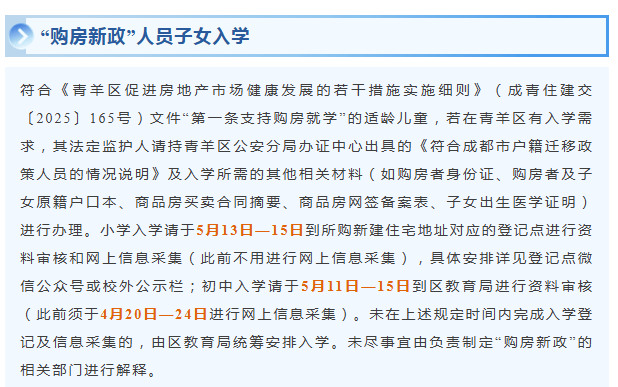 另外,在青羊区买了房但没迁户口的家长,可以留意一下“购房新政”人员子女入学的政策。此前对网签备案的时间要求是2024年1月1日到2026年2月28日。在这期间买房的家长,如果今年娃娃上小学或初中,按流程提交资料,审核通过后会统筹安排学位。