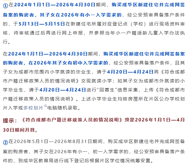 在2024年1月1日至2026年4月30日期间,于成华区购买新房(二手房不算)并完成网签备案的购房者,娃娃今年要上小学一年级或初中一年级的,可以提交入学申请,分配方式仍然是统筹安排学位。具体流程和所需材料见下图: