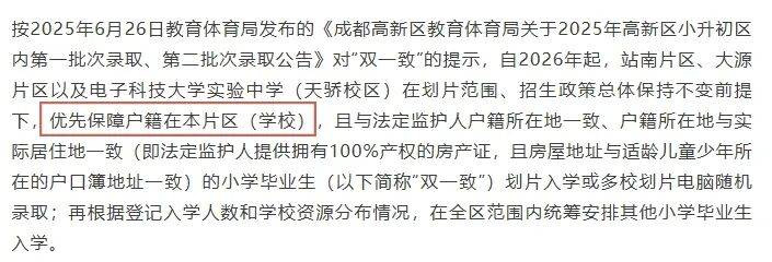 和青羊区不同的是,高新区的“两个一致”具体到了户籍所在的片区(或学校)。不论学籍在哪,户口必须在站南、大源,并且满足“两个一致”,才能在这两个片区升学。