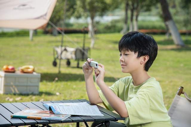 (图片说明:孩子正在使用阿尔法蛋词典笔进行户外阅读)