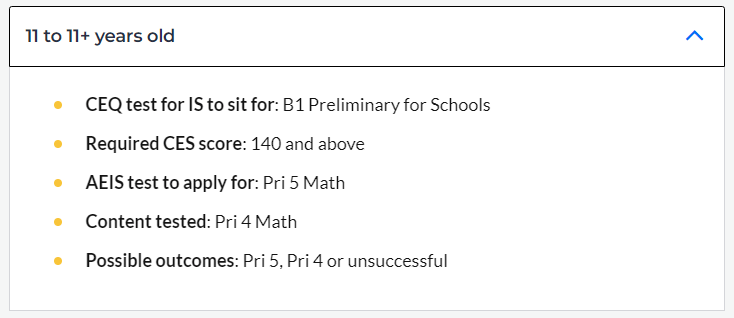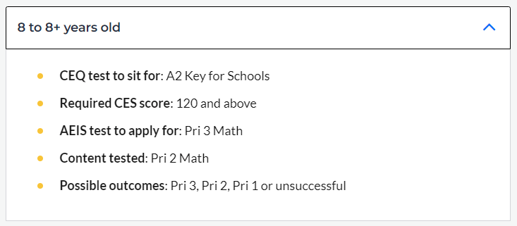 以下是报考AEIS各年龄段所需CEQ成绩
