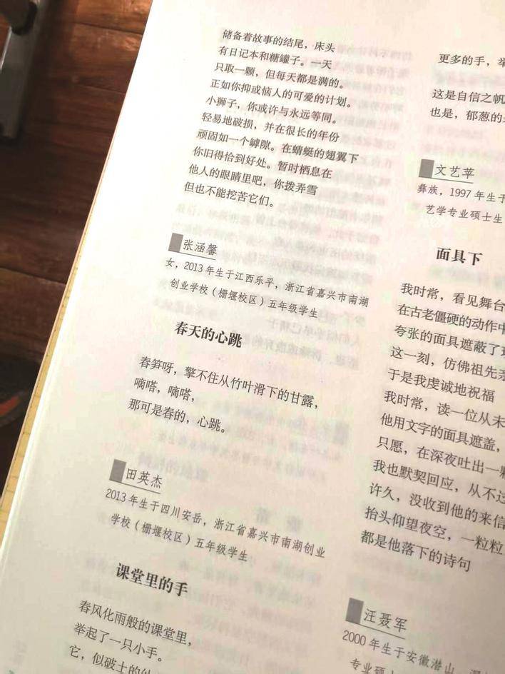 春日的午后,在校园长廊上,张涵馨向记者分享自己的创作灵感:“我的老家江西和现在生活的浙江都有很多竹林,那天看到竹叶上的水珠一颗颗往下落,砸在春笋上,声音很轻很脆。我突然觉得那不是水滴落的声音,是春天在悄悄说话。”不善言辞的小姑娘用笔尖文字留住那个瞬间,让读到诗的人也能听见春天的心跳。