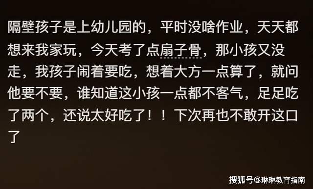 小孩没觉得面前的阿姨是在跟自己假客气,而是很高兴地答应了,然后吃了两根扇子骨,一边吃一边夸赞阿姨做的扇子骨太好吃了,可家长听到这些话,却一点都高兴不起来。