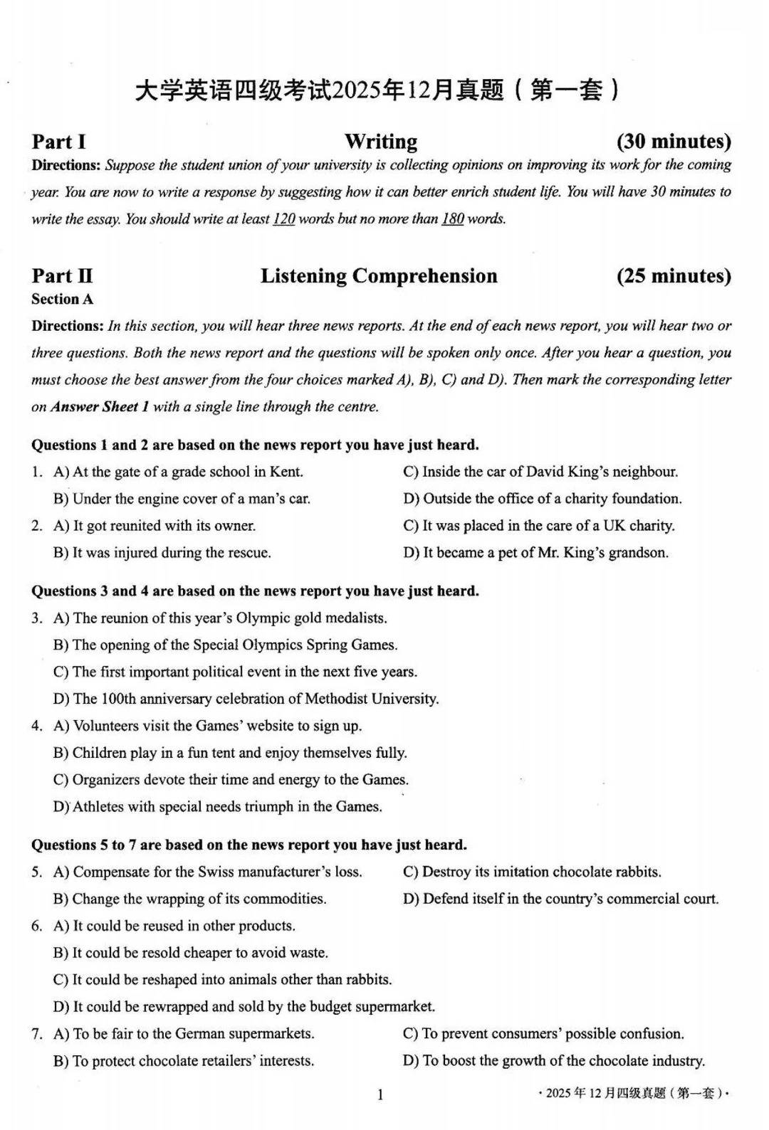 2025年12月英语四级真题试卷及答案解析(第一套)