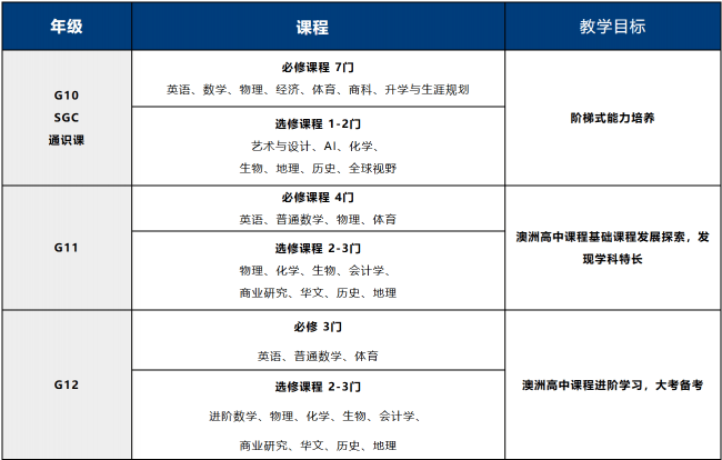 学生在G10年级以SGC通识课程为主要学习内容,进入G11年级后,学生可根据自己的学情、特长和未来大学方向进行课程选择“2+2新加坡中本贯通课程”,锁定世界前200大学、“3+3 新加坡SIM定向课程”,定向升学新加坡第一梯队私立大学或 “3+3新加坡名校直通课程” ,冲刺世界前50大学。