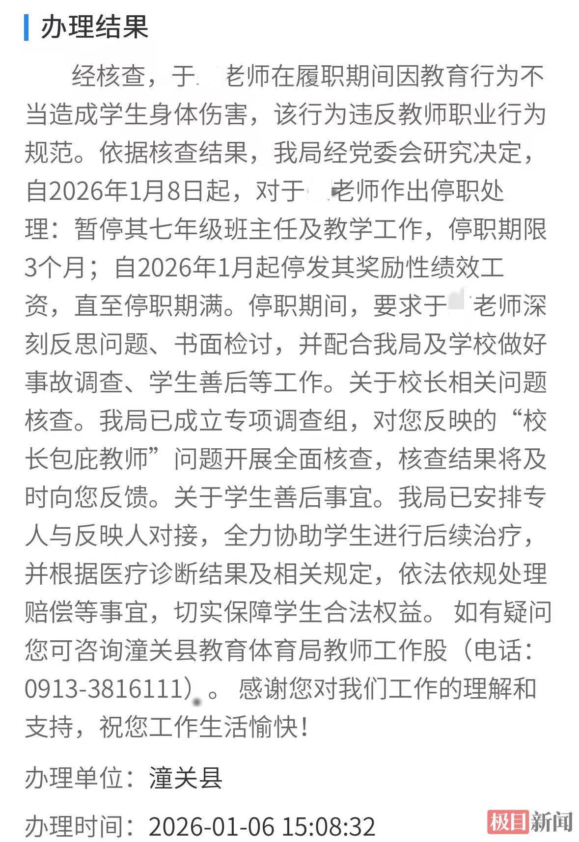 1月6日,潼关县教体局通过12345回复:经核查,于某在履职期间因教育行为不当造成学生身体伤害,违反教师职业行为规范。该局经党委会研究决定,自1月8日起,于某停职3个月;停职期满前停发其奖励性绩效工资;停职期间,要求于某深刻反思问题、书面检讨,并配合该局及学校做好事故调查、学生善后等工作。