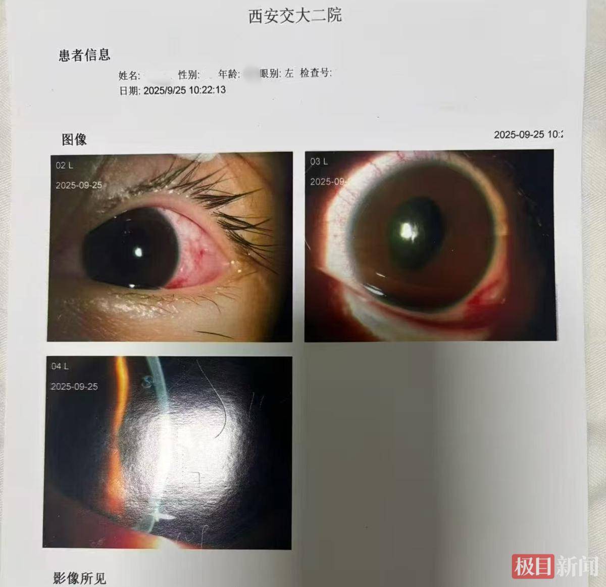 潼关县医院医生通过仪器检查发现,小雅左眼内部在出血。经医生简单医疗处置后,白静和丈夫带着小雅到西安交大二附院诊治,事发当天小雅在此住院治疗。