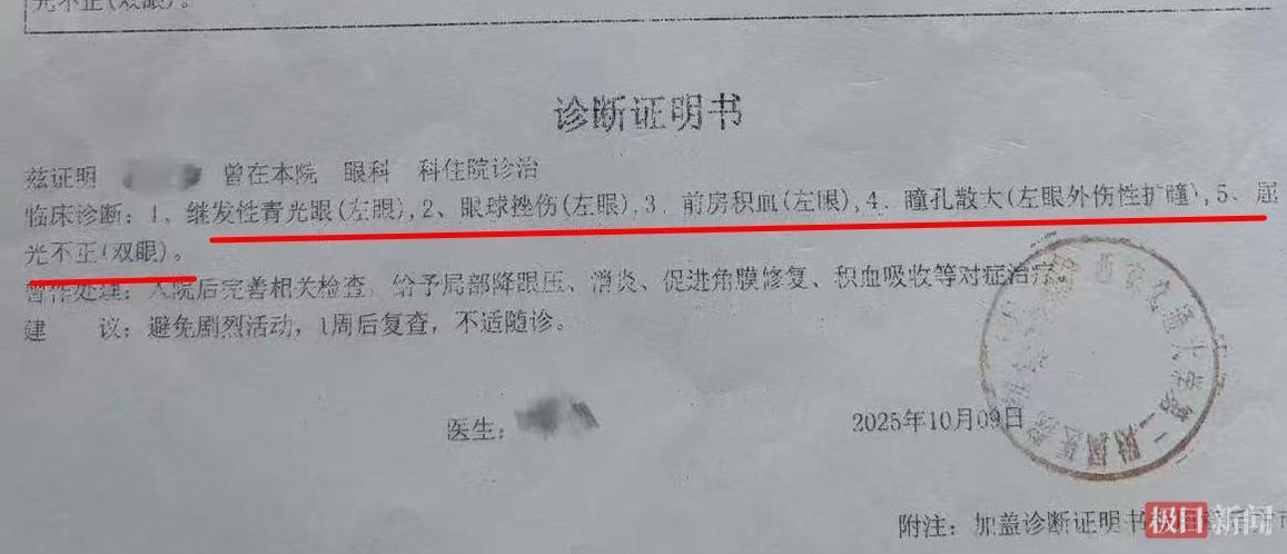 报案后,校方同意家长带小雅到外省进一步诊治。12月16日,中山大学附属眼科医院门诊病历显示,小雅左眼被诊断为继发性青光眼、眼挫伤、外伤性瞳孔散大和屈光不正。