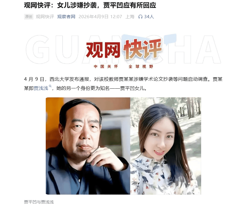 观察者网强调:一个不容回避的事实是,贾平凹在这一事件中的特殊位置。作为中国当代重要作家,他与西北大学长期保持密切联系,既是校友,也曾受聘任教,相关研究机构与文学馆亦以贾平凹的名字命名设立。2015 年西北大学成立贾平凹研究中心,2020 年西北大学贾平凹文学馆在太白校区开馆。贾浅浅的学术路径与研究方向,与其父亲存在高度关联。贾浅浅为西北大学文学院副教授、博士,本科、博士均就读于此,发表的多篇论文、学术课题也是以贾平凹为主题。