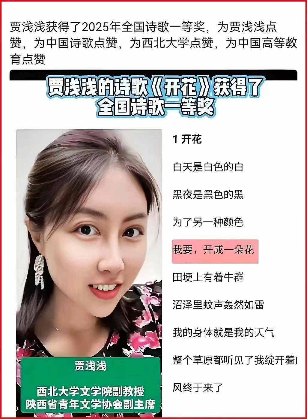 2025年她的一首诗,获得了一等奖。就是这个一等奖,让不少人怀疑,她获得这个一等奖,是不是走后门了?