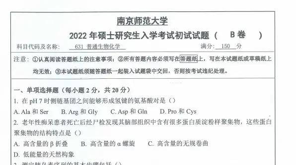 2000-2024年南京师范大学632普通生物化学考研真题试卷【23-24回忆版,无选择判断题】