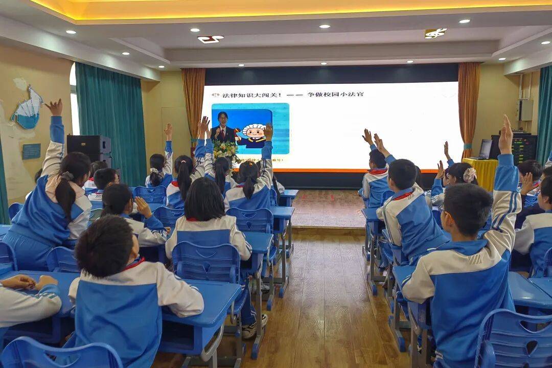 本次宣讲以“给成长穿上‘法律铠甲’——现实与网络世界的规则之旅”为主题。在现实世界篇,干警结合相关法律法规,通过虚拟人物小宇遭遇欺凌的系列场景,用浅显易懂的语言讲解了校园欺凌的表现形式及法律后果,并结合校园内经常发生的案例,讲解了未成年人侵权的民事责任。网络世界篇则聚焦网络诈骗、网络谣言、网络隐私保护等方面,详细剖析了网络诈骗套路及网上泄露隐私、传播谣言的后果。现场还设置了法律知识大闯关、情景剧场等互动环节,充分调动孩子们主动思考、踊跃答题的积极性,让大家在轻松愉快的氛围中学会分辨危险、保护自己,深刻认识到遵守法律和规则的重要性。