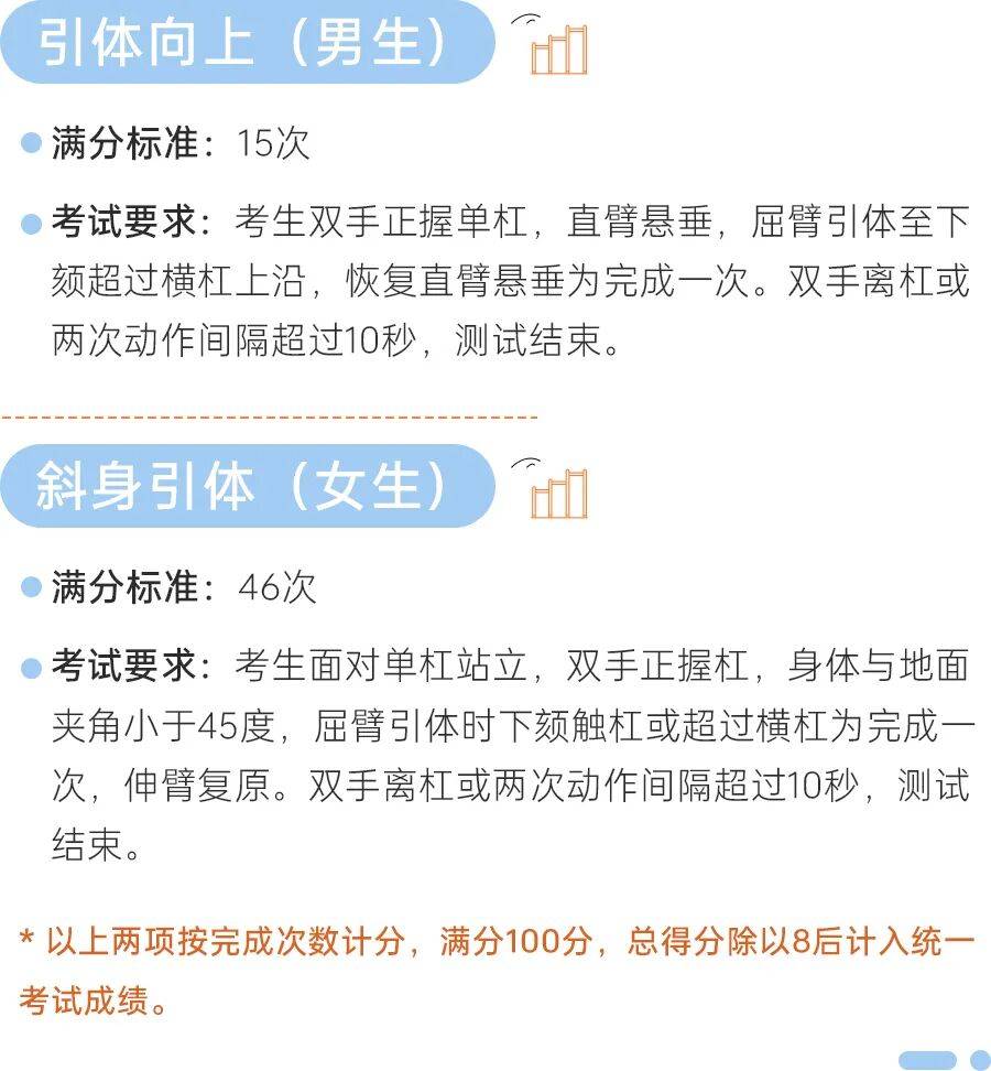 另一个需要家长和学生选择的,则是二选一(引体向上/斜身引体 vs 实心球)项目。 同样,先看考试要求和满分标准。