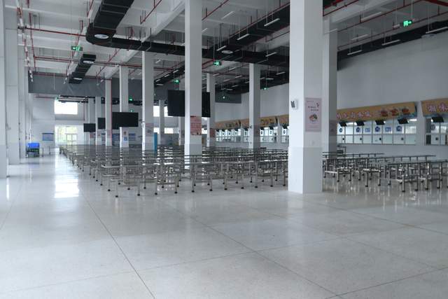 食堂中央有好几块大屏,桌椅旁边放了好几个紫外线杀菌筷子消毒车,可以看出各种设备都很全。
