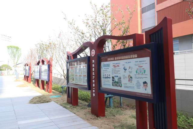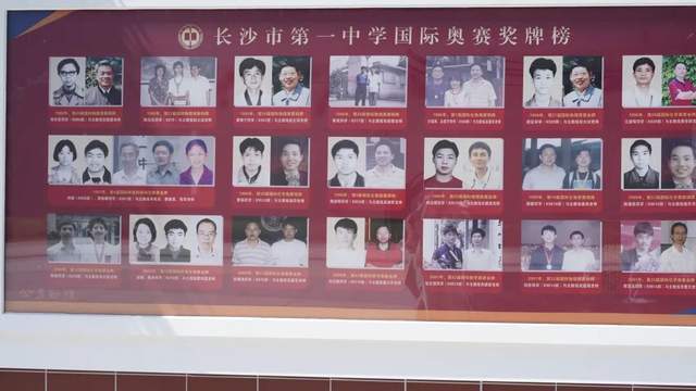 我们现在所处的位置叫作立德大道,大道右侧是学校宣传栏,上面有长沙一中院士校友的简介,还有从1989年开始到现在一中获得的国际奥赛奖牌。