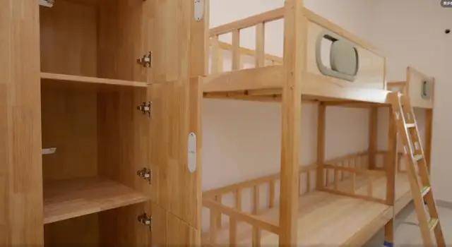 宿舍内是上下铺的形式,4人一间,床、衣柜都是实木的。