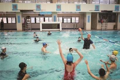 敬业中学游泳课上,赵治国老师在课程中加入水球互动环节,学生既锻炼体能,又把技术运用到实践中。