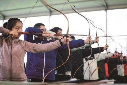 华东师范大学“中华射艺”课融入礼仪教育,学生们凝神屏气,学习蒙古式控弦和高位开弓。