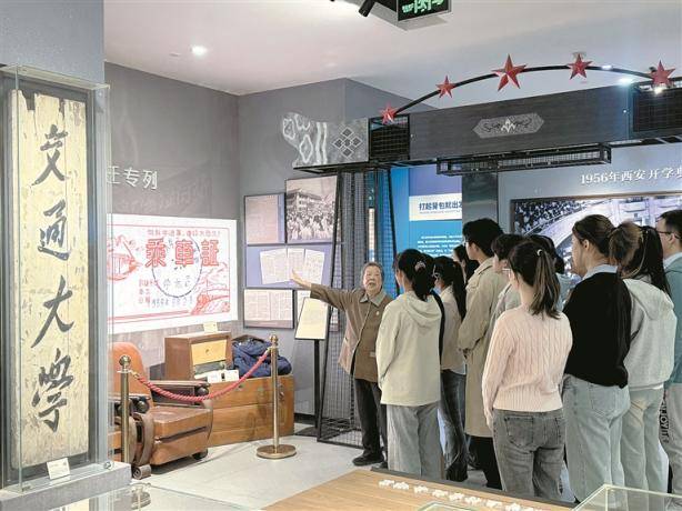 图为4月8日,在交大西迁博物馆内,西迁老教授胡奈赛为青年学子讲述西迁往事。 西安交通大学供图