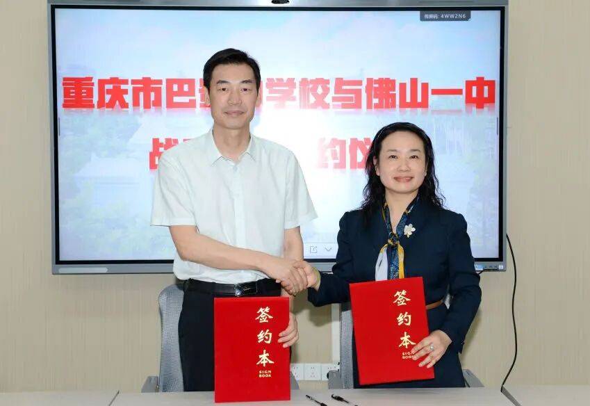在禅城区教育局党委委员、副局长赵骥等嘉宾见证下,佛山一中党委书记范自军与重庆市巴蜀中学校党委副书记汪红霞共同签署《战略合作框架协议》。