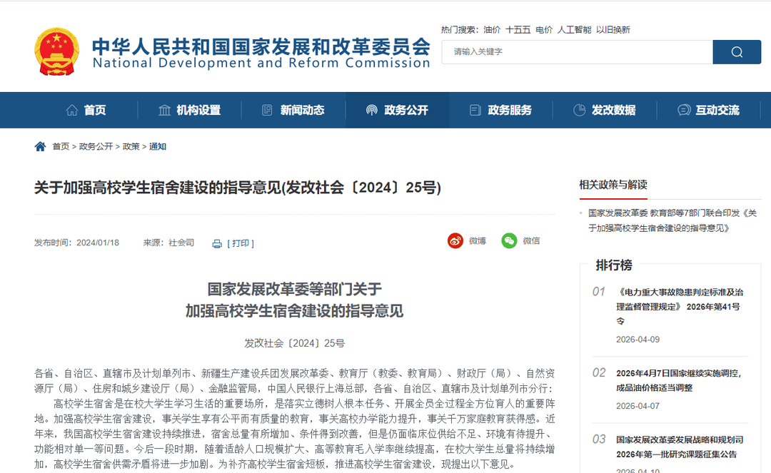 事实上,高校“买楼、租楼”已有政策加持,早在2024年1月,国家发展改革委、教育部等7部门联合印发《关于加强高校学生宿舍建设的指导意见》(以下简称《指导意见》)。《指导意见》提出,多渠道支持高校学生宿舍建设,优化高校学生宿舍功能设置,加强学生良好卫生习惯和健康生活方式培养,营造良好育人环境,努力把高校学生宿舍打造成为落实立德树人根本任务、开展“三全育人”的重要阵地,为建设教育强国、人才强国提供有力支撑。