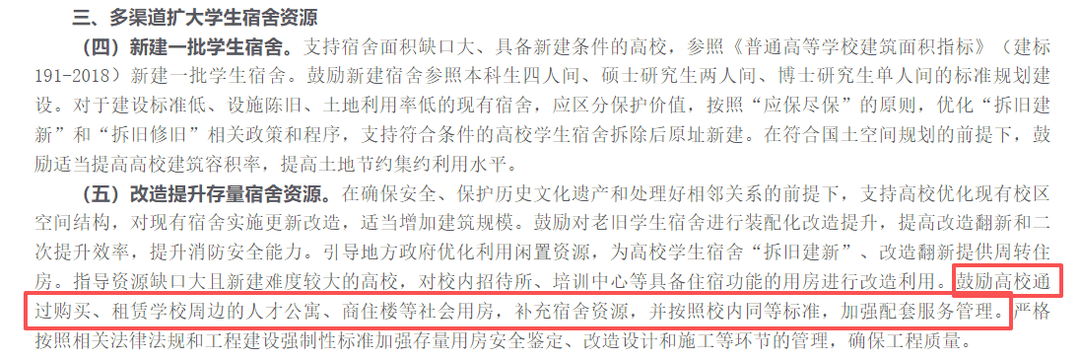 《指导意见》中“多渠道扩大学生宿舍资源”提到,鼓励高校通过购买、租赁学校周边的人才公寓、商住楼等社会用房,补充宿舍资源,并按照校内同等标准,加强配套服务管理。“健全配套政策体系”中也提到了:对学生宿舍面积总量缺口大、学生反映强烈的高校,原则上不得新增安排招生指标,问题突出的要压缩招生指标。