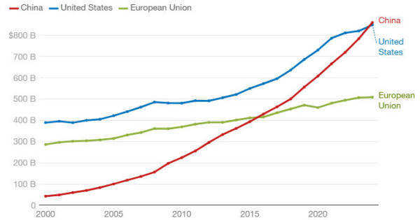 另据美国大学协会网站3月份消息,根据OECD的评估指标,2024年,中国在研发领域的总投资额(按当前美元价值计算)达到1.03万亿美元,超过了美国的1.01万亿美元。