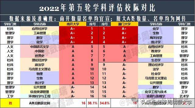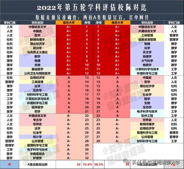 值得注意的是,华五与后面高校之间的差距是结构性的。排名第七的中国人民大学,A类总数18个,A+11个,虽然总量接近华五尾部,但在理工医学科上的天然短板让它难以在综合排名中更进一步。而排在第九的北京师范大学,A+数量达到7个,A类总数20个,已经是华五之下A+最多的学校之一。但无论是A+数量还是A类总数,从第九名开始,与华五之间都出现了一个明显的“断档”。这个断档,恰恰说明了中国顶尖大学已经形成了相对固化的分层。