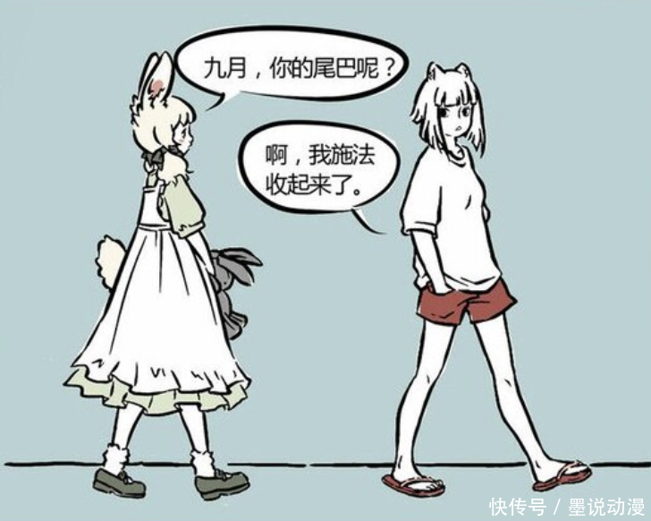 九月有一段时间,是用法术把尾巴收起来。小玉发现了这个情况,也问了她尾巴怎么消失。没有尾巴的九月,看起来倒是跟普通人类女孩没有太大区别。加上人字拖,这悠哉休闲的感觉也就来了。