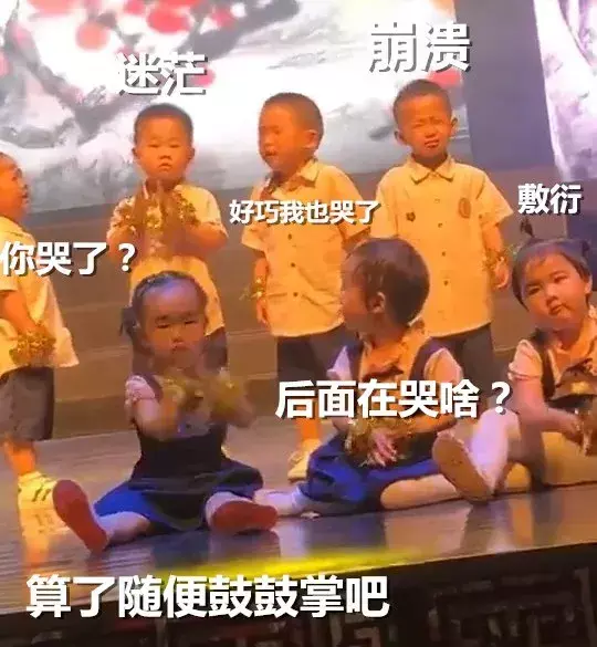 头饰飞了,台下都是不认识的叔叔阿姨,好害怕,但是小伙伴都在跳舞,自己也要跟上节奏:自己上台或许有些尴尬,但一群人上台就好多了...?