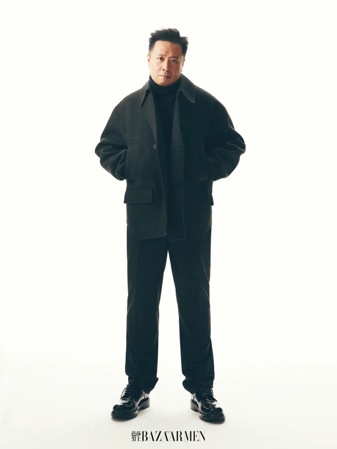 蓝色羊毛风衣、 黑色高领毛衣均为Brunello Cucinelli