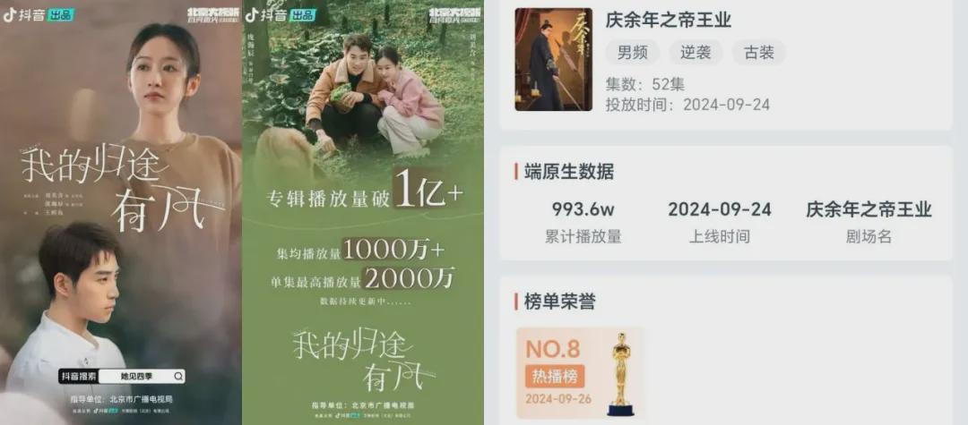 这些改编短剧上线后迅速获得了极高的市场热度,表现出强劲的传播力和用户吸引力。《我的归途有风》专辑播放量破1亿。《庆余年之帝王业》上线第二天累计播放量即接近1000万,相关抖音话题量接近60万,《大话大话西游》表现同样亮眼,上线12小时全网播放量突破千万,并连续4天蝉联DataEye短剧端原生热播榜日榜榜首。这也证明了,经典IP与短剧形式的结合确实具有强大的市场吸引力。