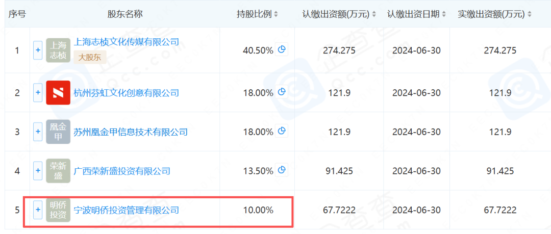 在杭州炳午影视传媒有限公司中,宁波明侨投资管理有限公司持股10%。