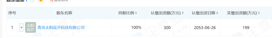 再往下看,该公司为 青岛太阳花开科技有限公司全资持股。