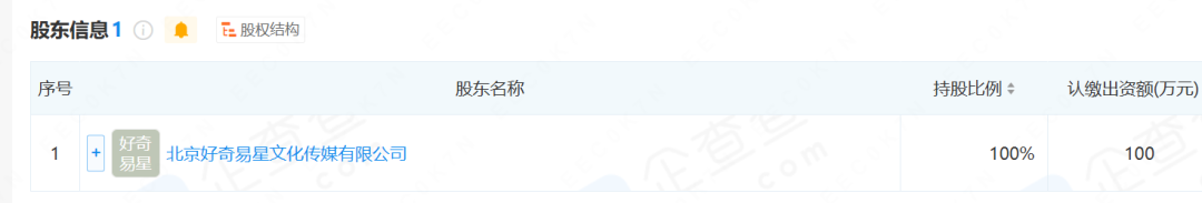 进一步股权穿透看到,这家 上海瑆璨文化传媒有限公司为 北京好奇易星文化传媒有限公司全资持股。