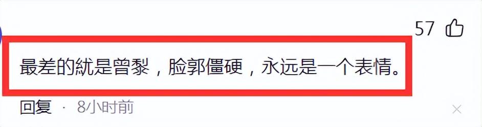 有网友指出,“最差就是曾黎,脸部轮廓僵硬,永远是一个表情”。