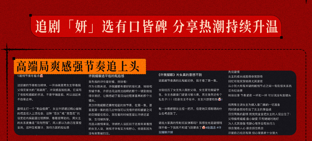 无论是“许妍好聪明”“担心许妍被拆穿”“心疼许妍”等话题,还是“许妍穿搭,我先学了”“《许我耀眼》丝滑运镜”等制作细节,始终在各大社交平台引起热议,让《许我耀眼》成为这个秋天观众最“走心”的追剧选择。