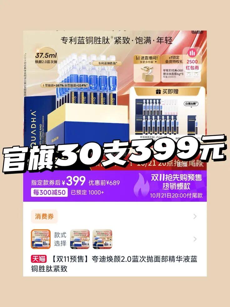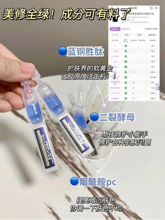 这次夸迪把专利级的菁纯蓝铜胜肽用在了“小蓝抛”里,且纯度达到了99.99%!实现了1支=促生胶原+紧致淡纹+修护屏障+嘭弹提拉!