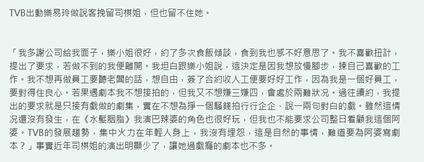 她不愿意敷衍拍戏,又不想挑剧本给人感觉嫌三嫌四,最终决定放慢脚步,没接受乐小姐的挽留,和TVB“和平分手”。