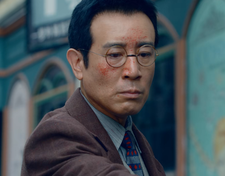 而在特务穷追不舍,目睹战友自尽后,他脸上沾着血迹,枪口指着谷正文,气势迫人,利刃一般的视线像是要将对方千刀万剐。