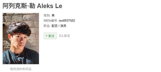 Aleks Le2018年起参演电影,相继出演《战火扶南》《宇宙之法 黎明篇》等作品。2021年为动画《生化危机:无尽黑暗》角色Jun See配音,次年参与《赛博朋克:边缘行者 第一季》的配音工作。他还为《街头霸王6》《鬼灭之刃》等作品角色配音。