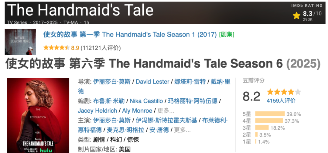 《使女的故事》是一部反乌托邦美剧,第一季时拿下了艾美奖的最佳剧集、最佳女主角、最佳女配、最佳导演、最佳编剧等多项大奖。