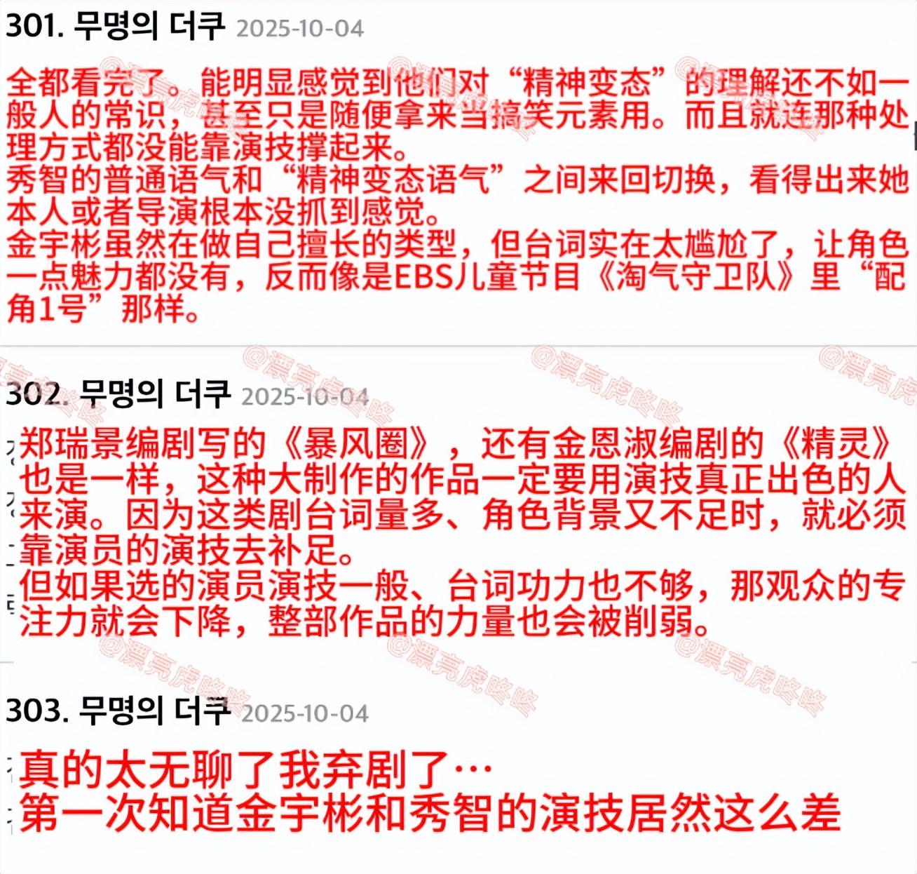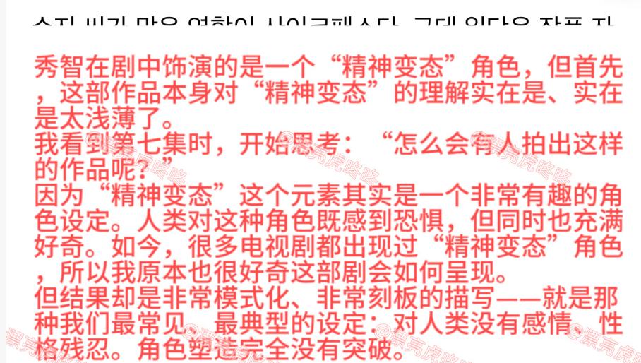 很多韩国网友表示她演的差,对角色的理解也挺肤浅,明明有个很丰满的精神病人设,最后她演出来的就是个差脾气大小姐,有种荒唐的反差感。