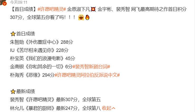 最近韩星裴秀智的新剧《许愿精灵》播出,在全球的热度还挺火,首日播出成绩就登上历史榜单前五,碾压大多数韩剧。