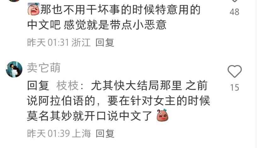 但偏偏剧里出现了邪恶的阿拉伯商人,一做坏事就用中文,说中文时还有种人机感,说不好还硬要说,就显得更加别扭。