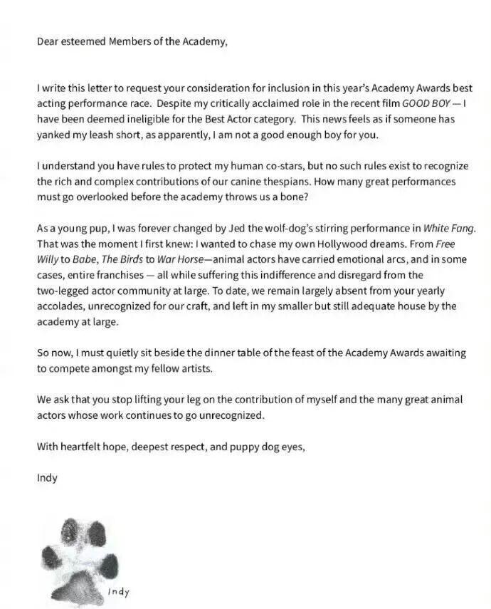 据外媒,恐怖片《好狗狗》主演小狗Indy向美国电影艺术与科学学院写信,提议奥斯卡设立动物演员表演类奖项:“还要有多少出色的表演被忽视,学院才会给我们一点认可呢?”信的结尾还有庄严签署的小狗爪印。
