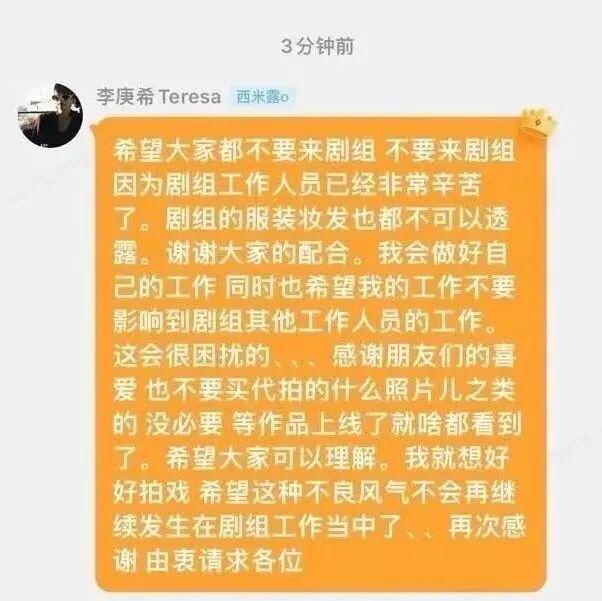 李庚希空降粉丝群称“希望大家不要来剧组,不要影响工作人员工作,也不要买代拍照片,我就想好好拍戏,希望这种不良风气不会再继续发生在剧组工作当中了。”