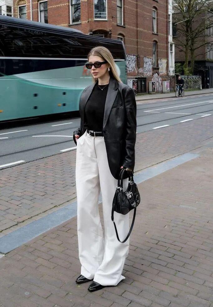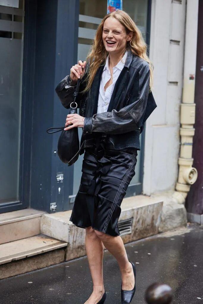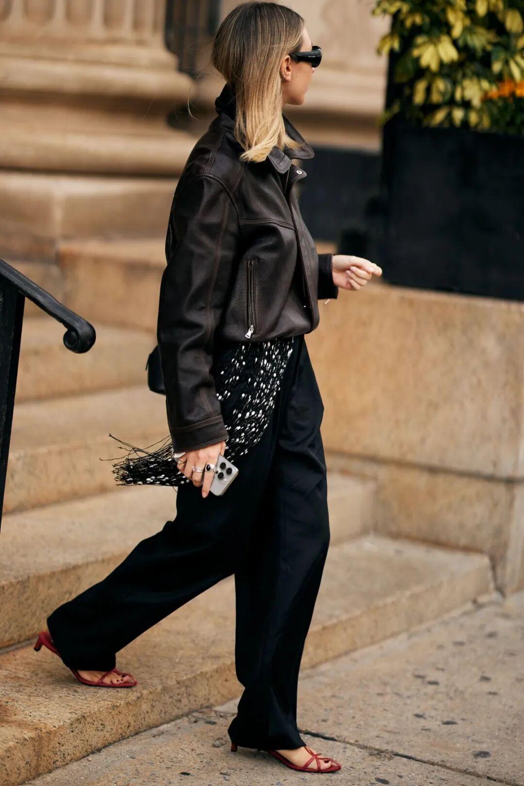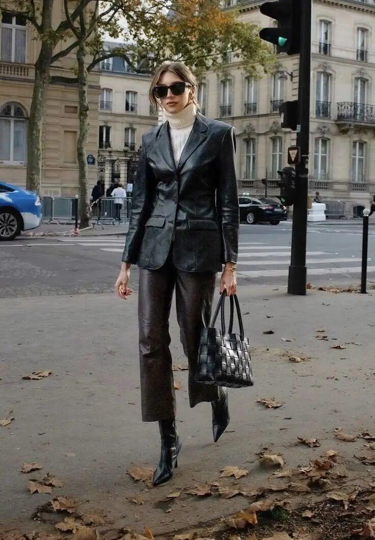 皮裤则宜与短款夹克、利落衬衫搭配,使比例更轻盈。